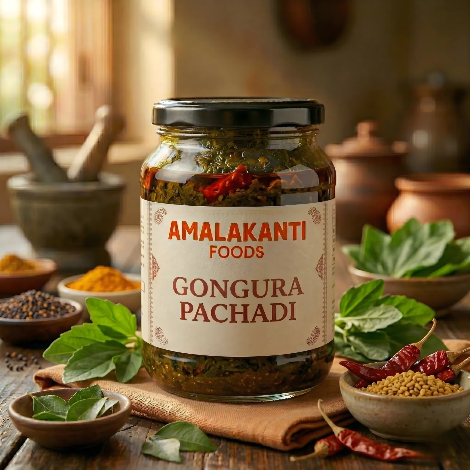 Authentic gongura pickle known for its tangy and spicy taste. Prepared using fresh sorrel leaves and traditional Andhra spices.