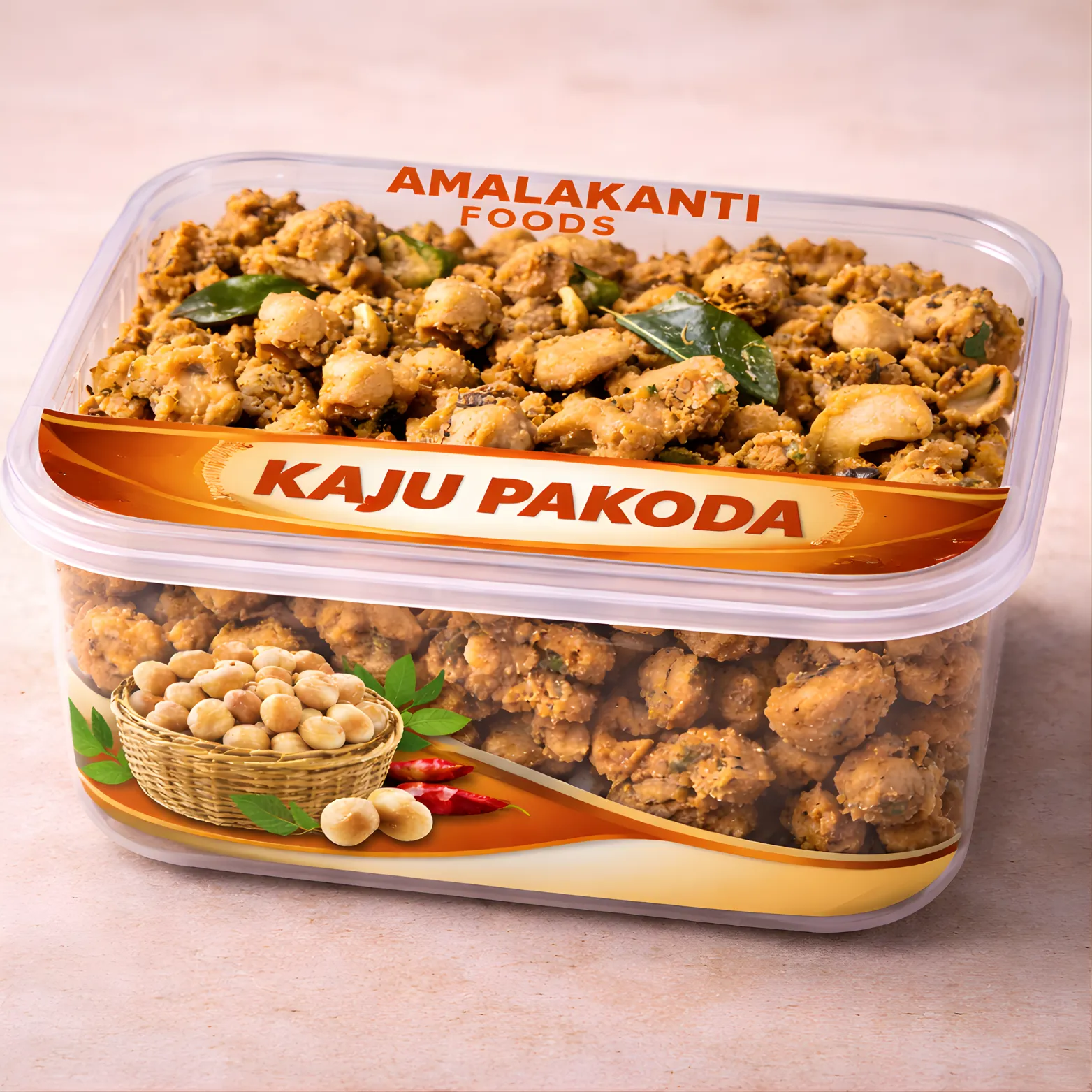 Crunchy fried cashew snack coated with gram flour and spices. A premium and tasty tea-time snack with rich flavor.